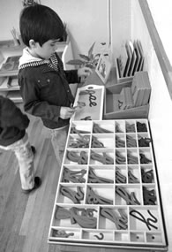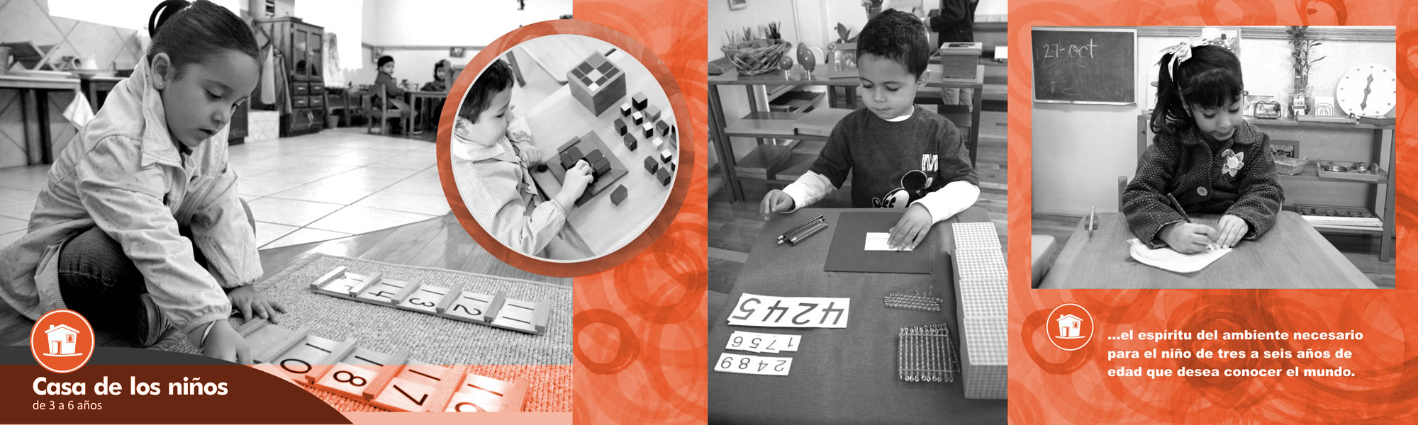 Lógica matemática: Mediante extraordinarios materiales como barras numéricas y cuentas de colores, ayudamos al niño a formar una mente lógico-matemática a través del estudio sensorial de la numeración, sistema decimal, concepto y memorización de operaciones aritméticas y fracciones.